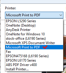 - នៅលើផ្ទាំង Printer ជ្រើសរើសយក Microsoft Print to PDF នៅក្នុងប្រអប់ Printer: